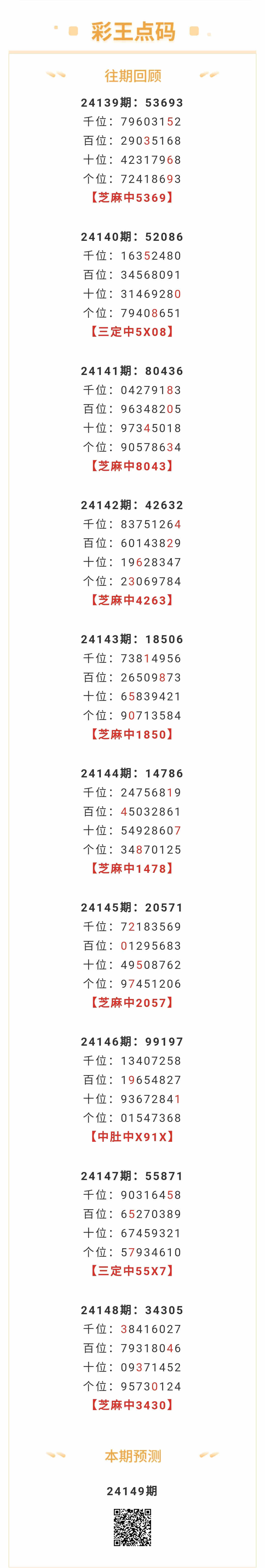 【排列五-24149期】本月圈中4次芝麻,芝麻近10中7;上期芝麻中3430