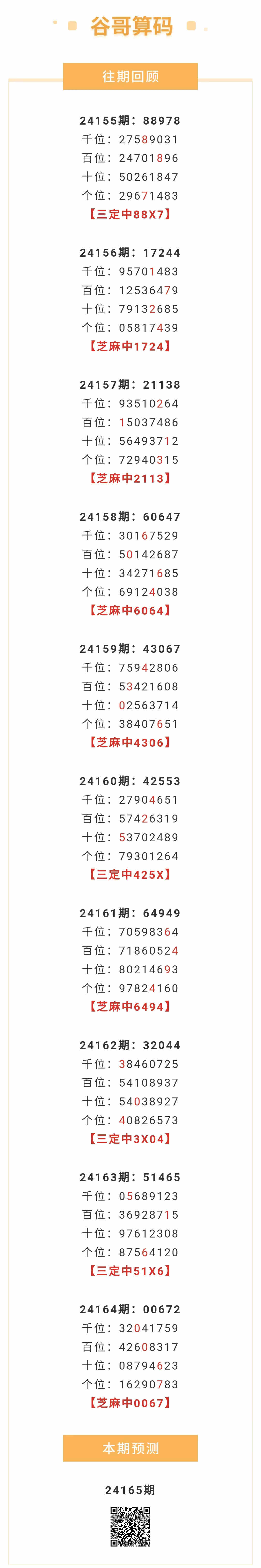 【排列五-24165期】本月圈中12次芝麻,芝麻近10中6;上期芝麻中0067