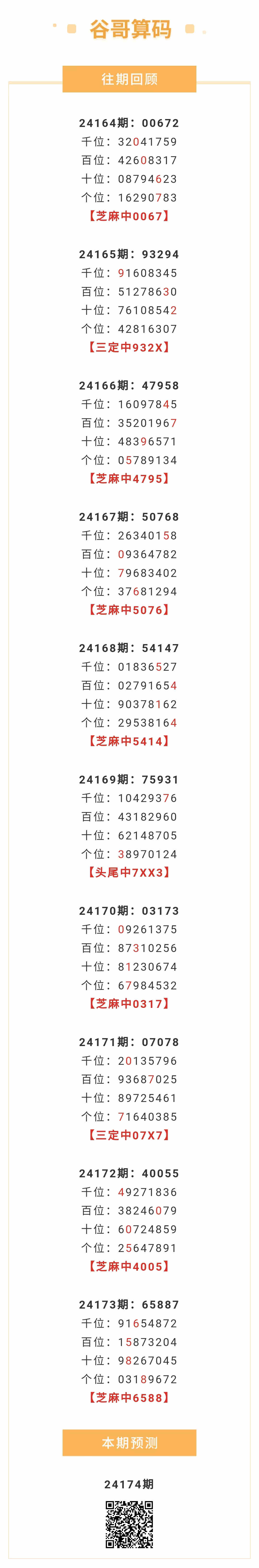 【排列五-24174期】上月圈中17次芝麻,芝麻近10中7;上期芝麻中6588