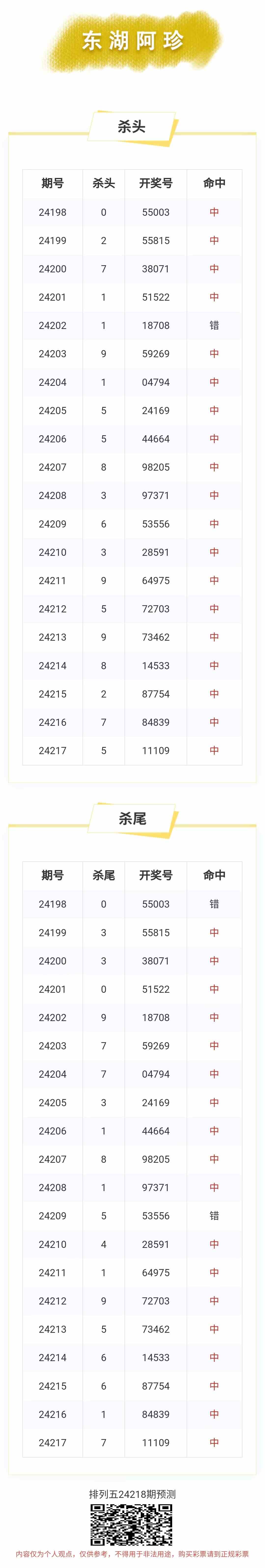 【排列五-24218期】本月圈中13次杀头尾,杀头尾近10中9;上期杀头尾中