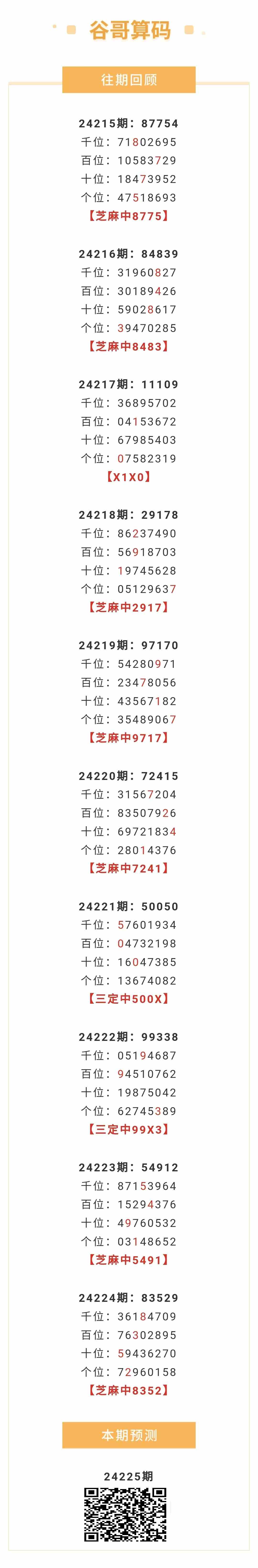 【排列五-24225期】本月圈中13次芝麻,芝麻近10中7;上期芝麻中8352