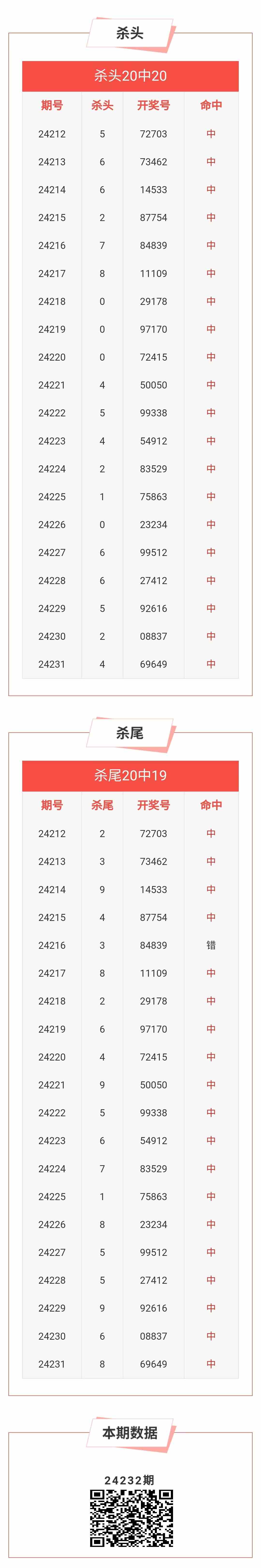 【排列五-24232期】本月圈中25次杀头尾,杀头尾近10中10;上期杀头尾中