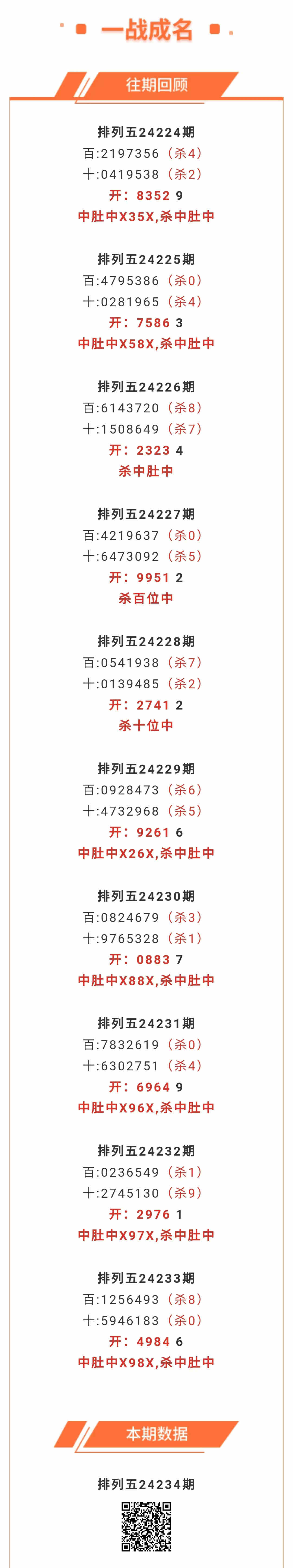 【排列五-24234期】本月圈中17次中肚,中肚近10中7;上期中肚中X98X,杀中肚中