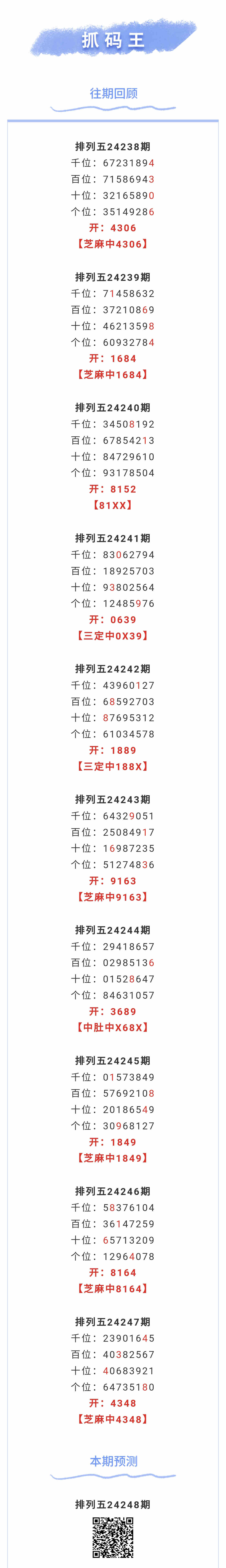 【排列五-24248期】本月圈中6次芝麻,芝麻近10中6;上期芝麻中4348