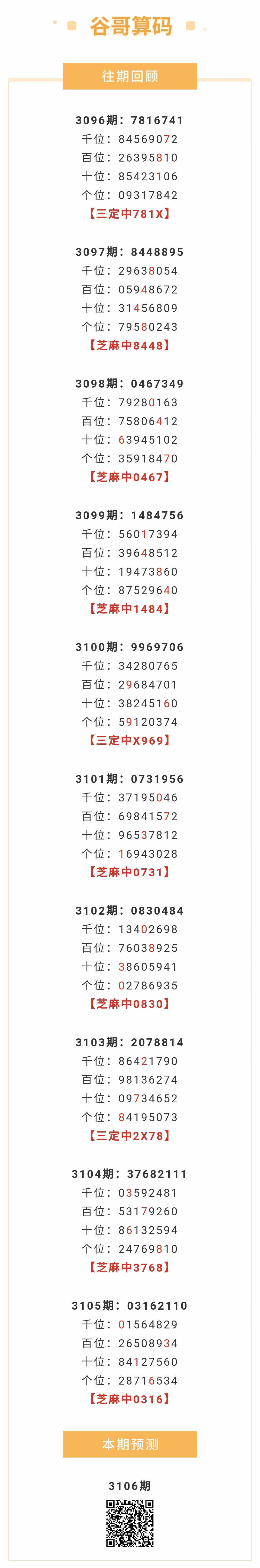 【七星彩-3106期】本月圈中7次芝麻,芝麻近10中7;上期芝麻中0316
