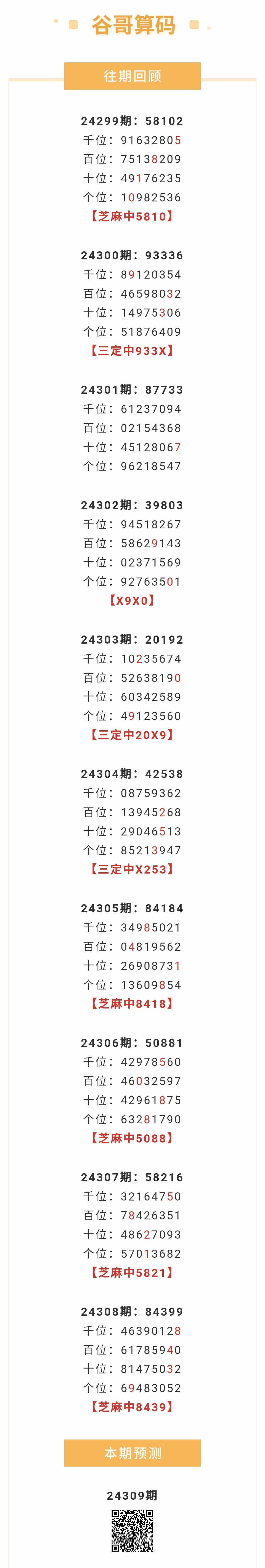 【排列五-24309期】本月圈中8次芝麻,芝麻近10中5;上期芝麻中8439