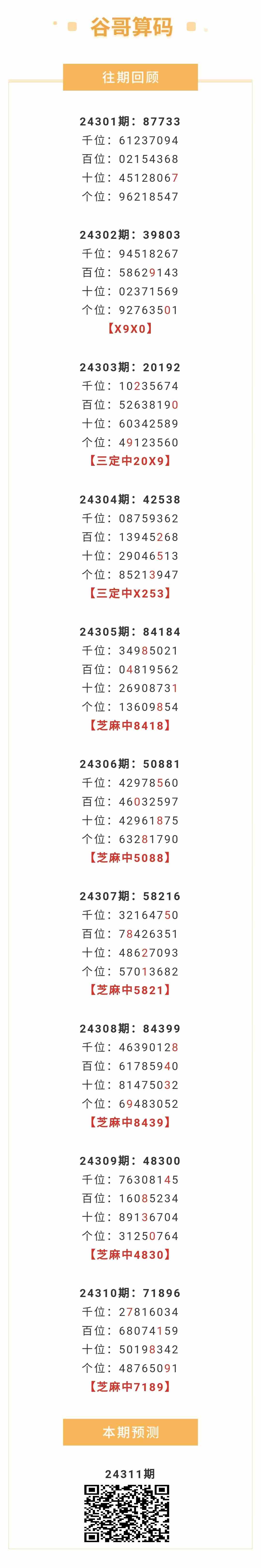 【排列五-24311期】本月圈中10次芝麻,芝麻近10中6;上期芝麻中7189