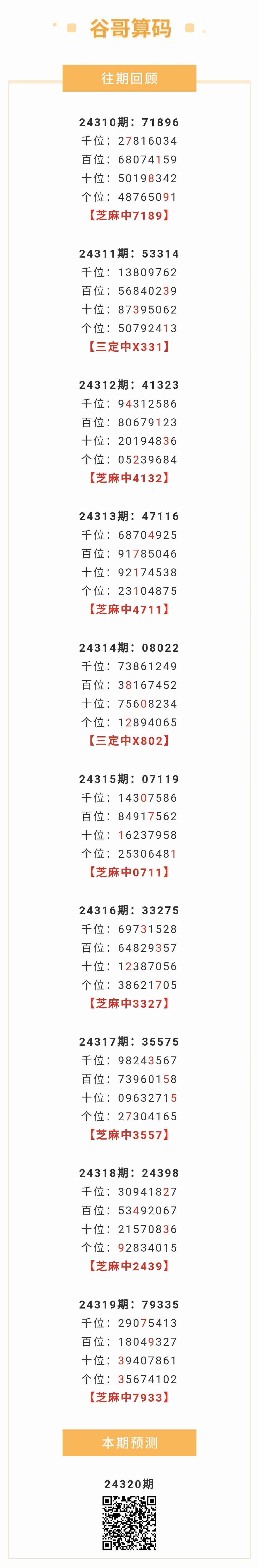 【排列五-24320期】本月圈中17次芝麻,芝麻近10中8;上期芝麻中7933