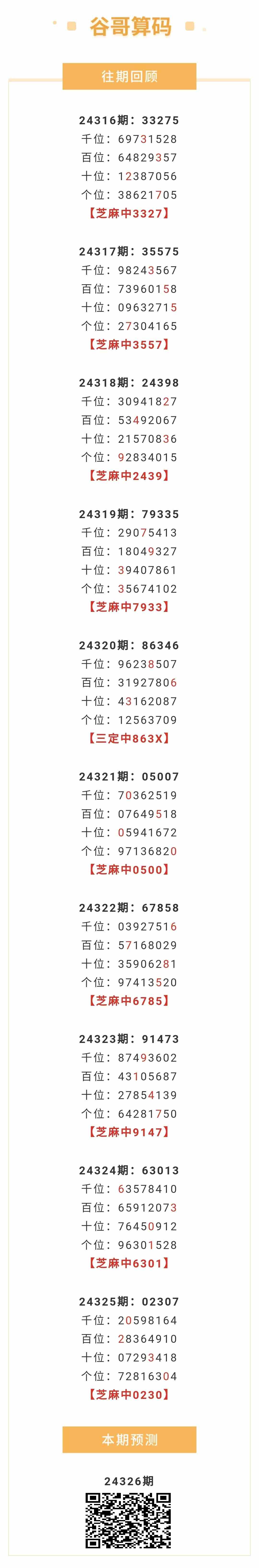 【排列五-24326期】本月圈中4次芝麻,芝麻近10中9;上期芝麻中0230