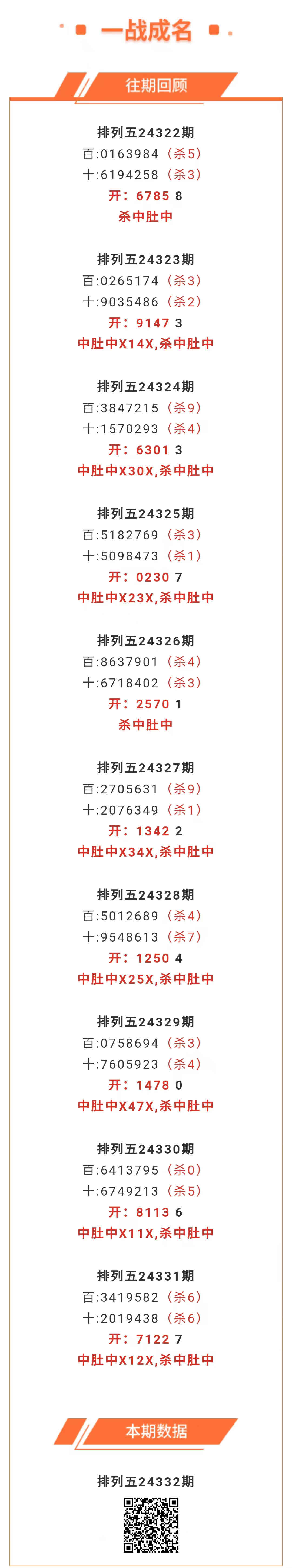 【排列五-24332期】本月圈中8次中肚,中肚近10中8;上期中肚中X12X