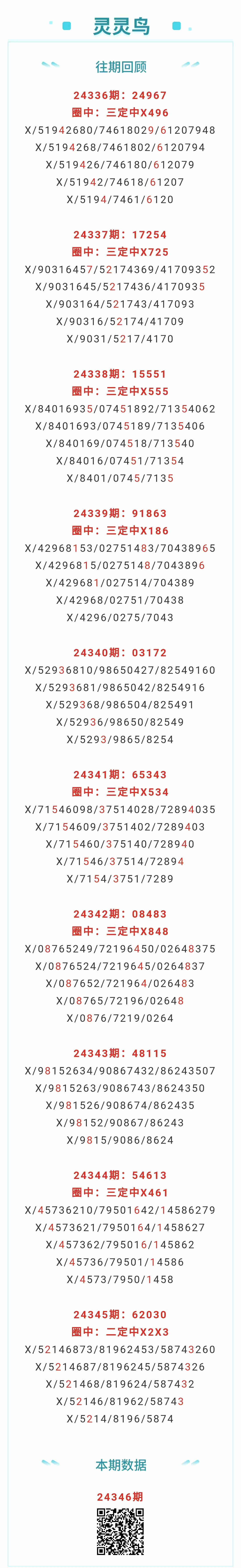 【排列五-24346期】本月圈中13次三定,三定近10中7;上期二定中X2X3