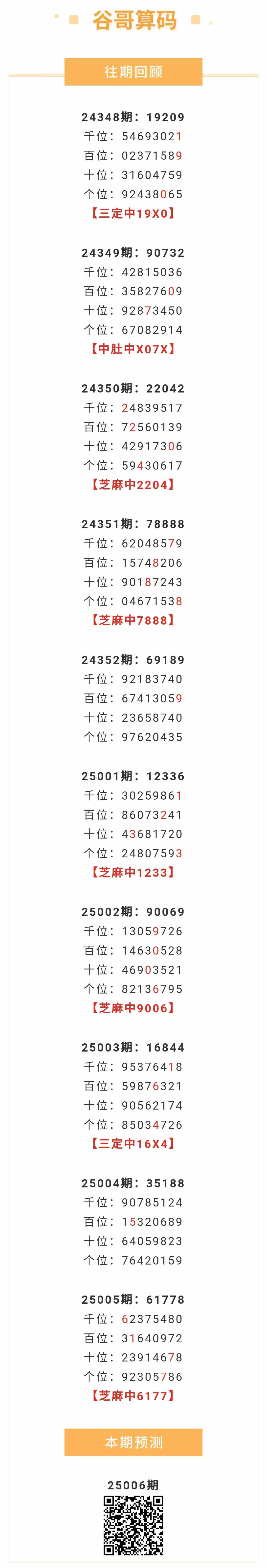【排列五-25006期】本月圈中3次芝麻,芝麻近10中5;上期芝麻中6177