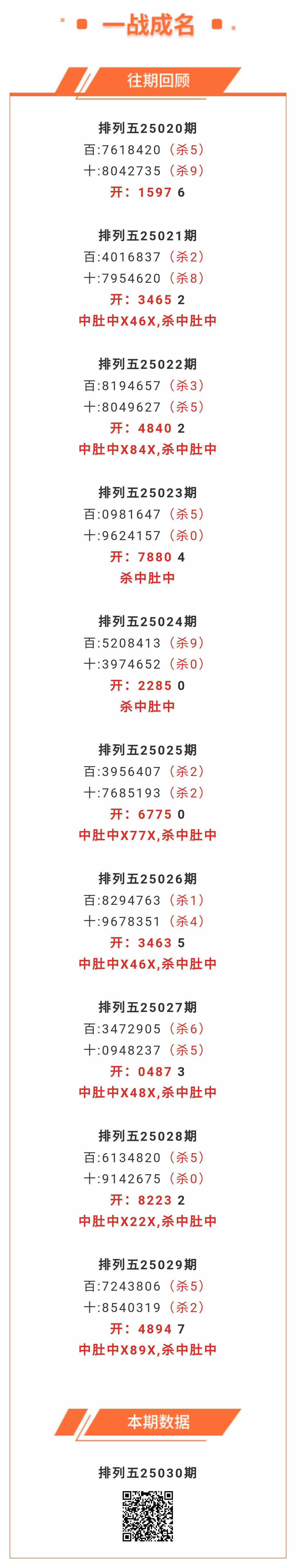 【排列五-25030期】本月圈中3次中肚,中肚近10中7;上期中肚中X89X