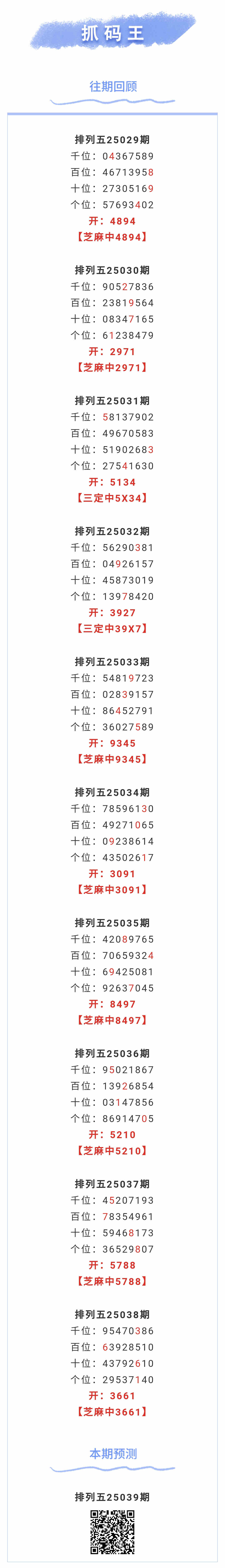 【排列五-25039期】本月圈中8次芝麻,芝麻近10中8;上期芝麻中3661