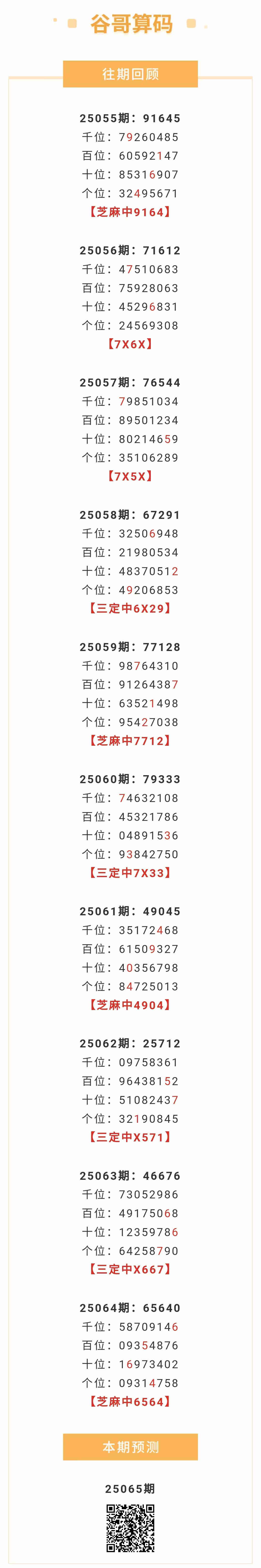 【排列五-25065期】本月圈中7次芝麻,芝麻近10中4;上期芝麻中6564