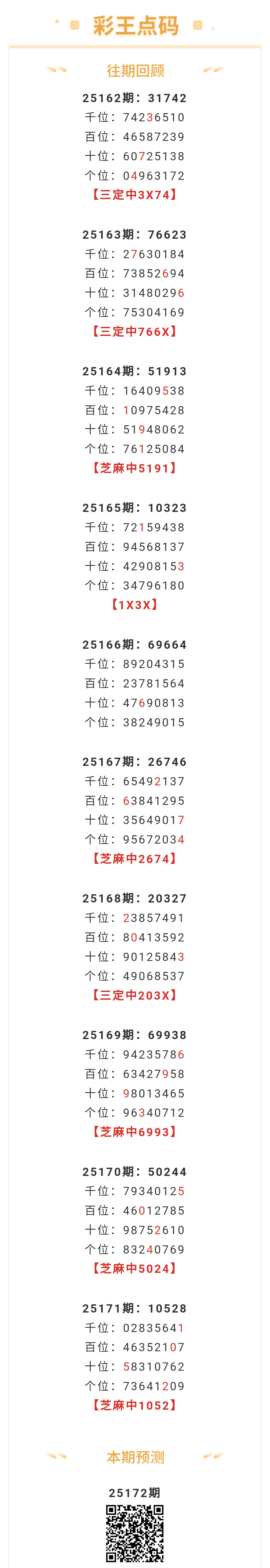 【排列五-25172期】上月圈中14次芝麻,芝麻近10中5;上期芝麻中1052