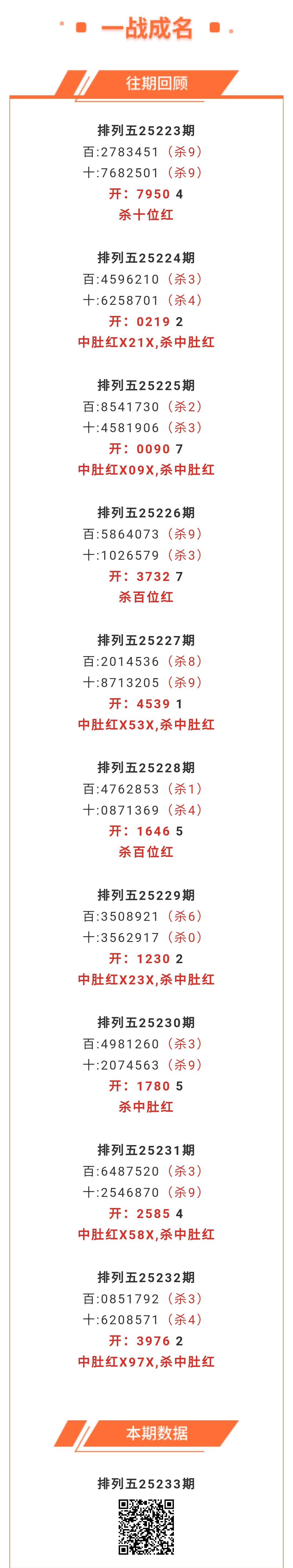【排列五-233期】本月圈红15次中肚,中肚近10红6;上期中肚红X97X