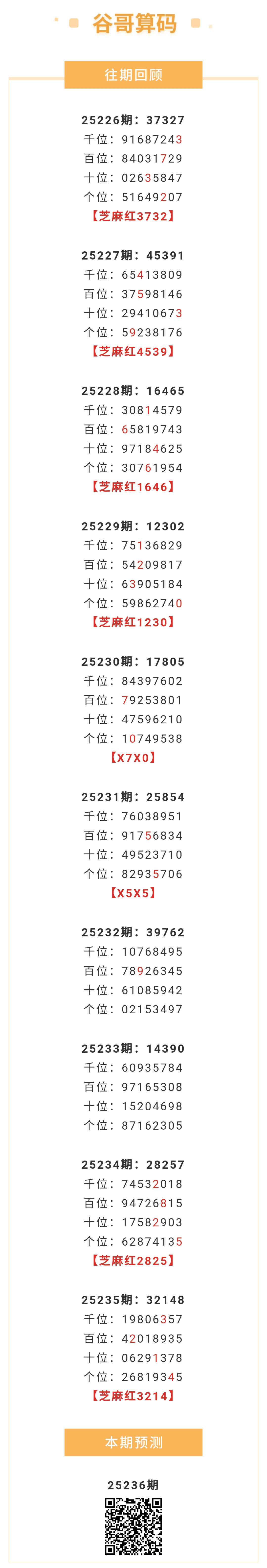 【排列五-236期】上月圈红11次芝麻,芝麻近10红6;上期芝麻红3214