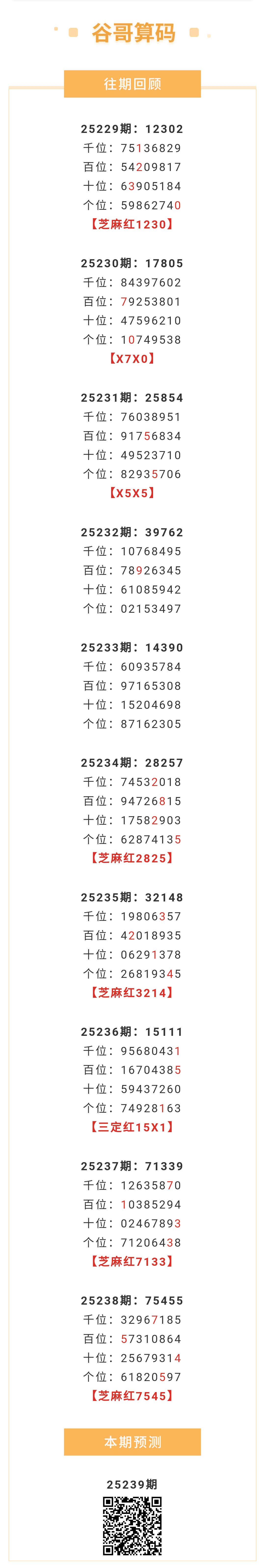 【排列五-239期】本月圈红4次芝麻,芝麻近10红5;上期芝麻红7545