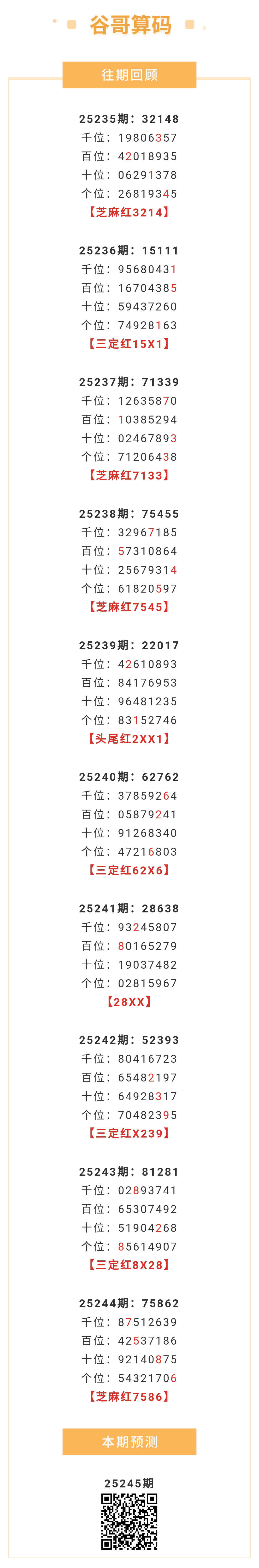 【排列五-245期】本月圈红5次芝麻,芝麻近10红4;上期芝麻红7586