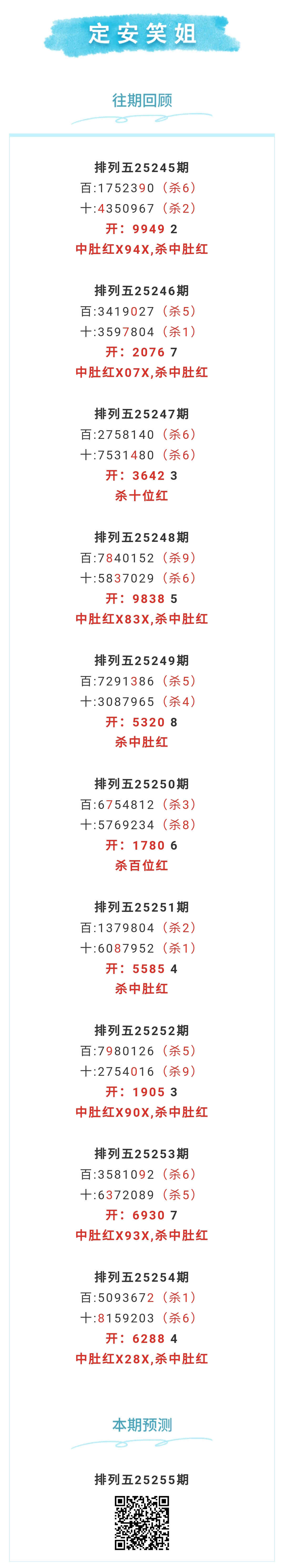【排列五-25255期】中肚2连红!本月圈红11次中肚,中肚近10红6;上期中肚红X28X