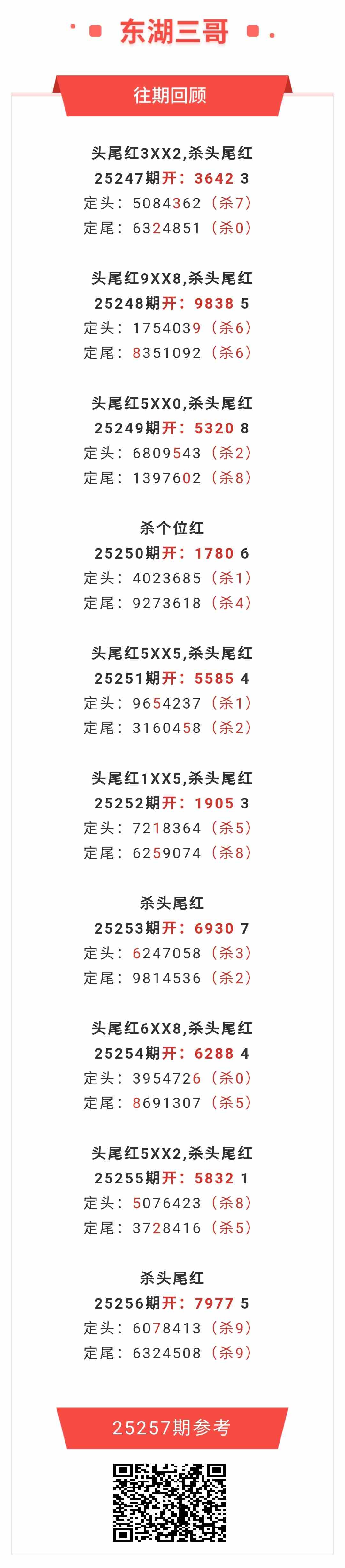 【排列五-257期】杀一四6连红,本月圈红12次一四,一四近10红7;上期杀一四红