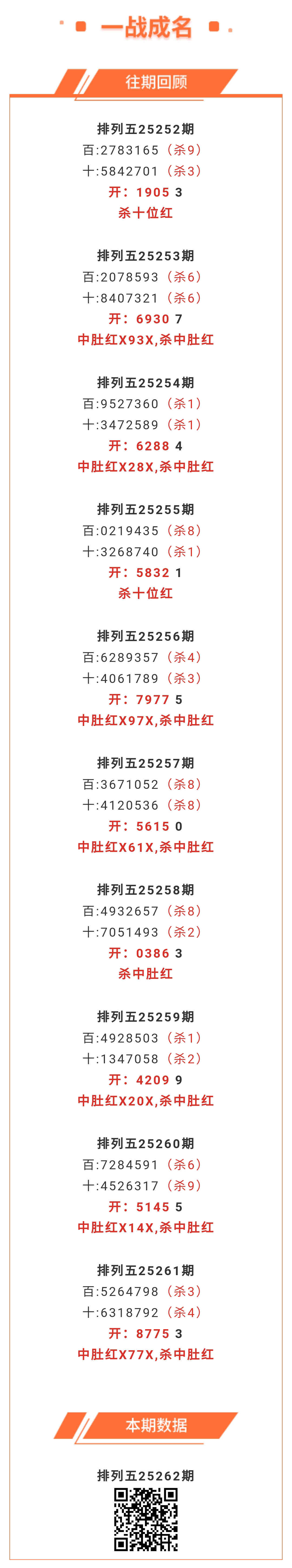 【排列五-262期】中肚3连红!本月圈红16次中肚,中肚近10红7;上期中肚红X77X