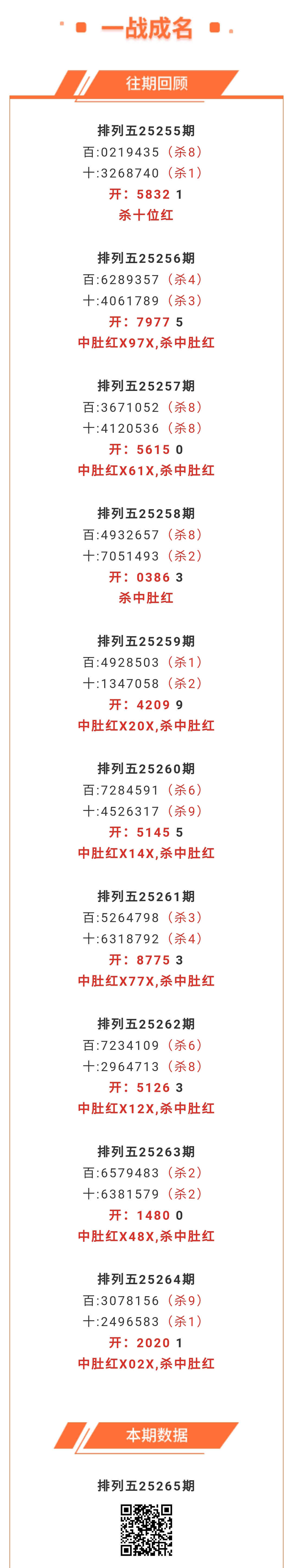 【排列五-265期】本月圈红1次中肚,中肚近10红8;上期中肚红X02X