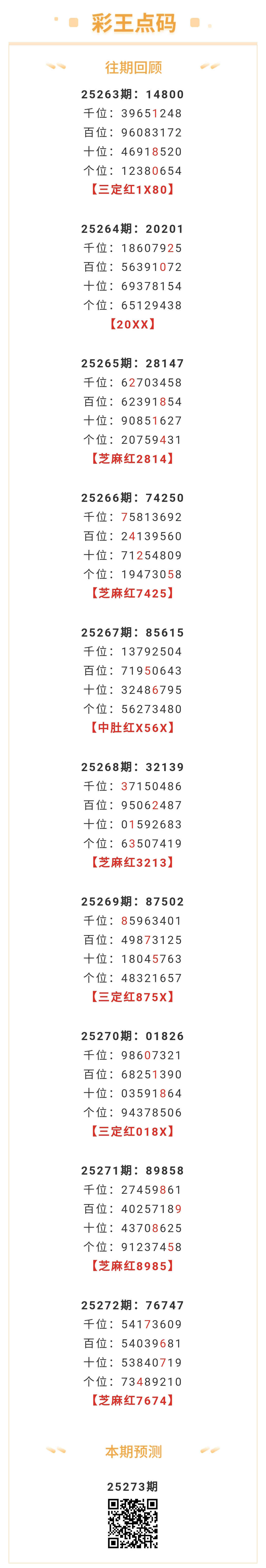 【排列五-273期】芝麻2连红!本月圈红5次芝麻,芝麻近10红5;上期芝麻红7674