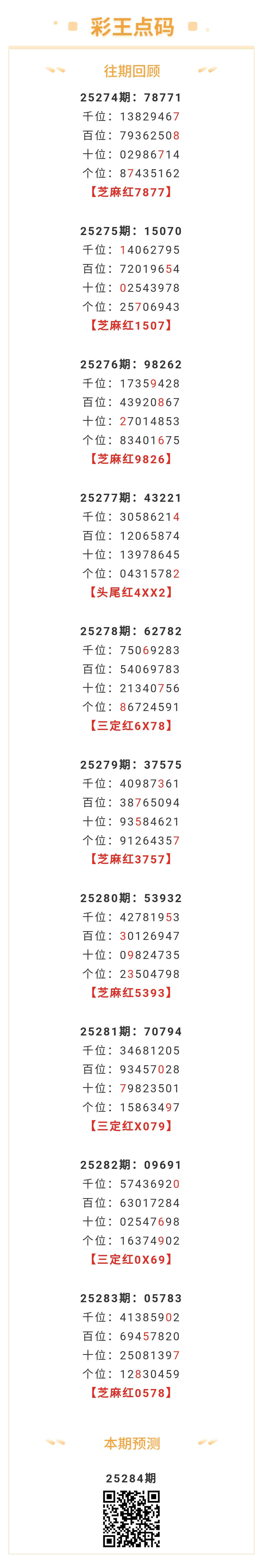【排列五-284期】本月圈红11次芝麻,芝麻近10红6;上期芝麻红0578