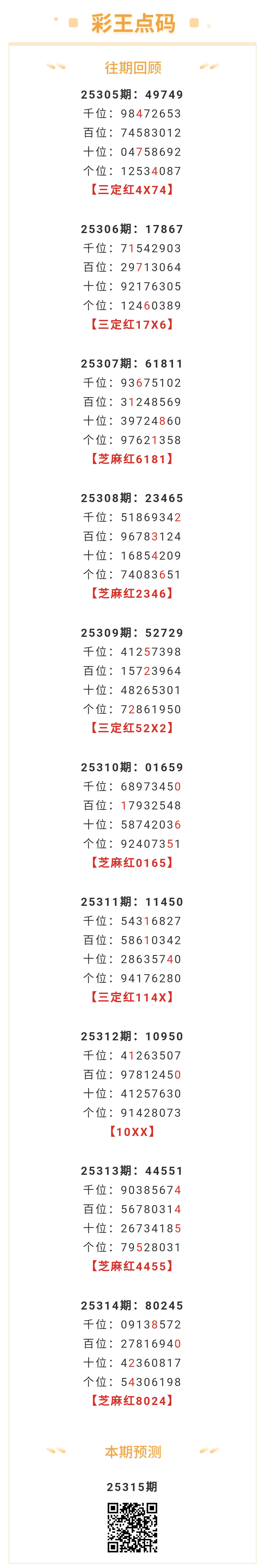 【排列五-315期】芝麻2连红!本月圈红8次芝麻,芝麻近10红5;上期芝麻红8024