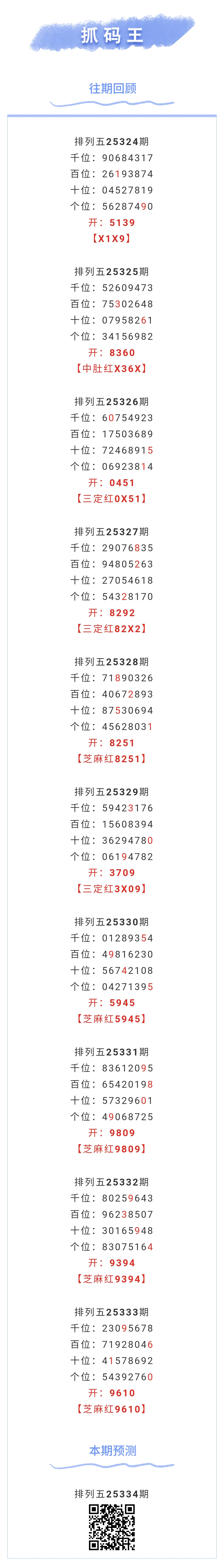 【排列五-334期】芝麻4连红!本月圈红7次芝麻,芝麻近10红5;上期芝麻红9610