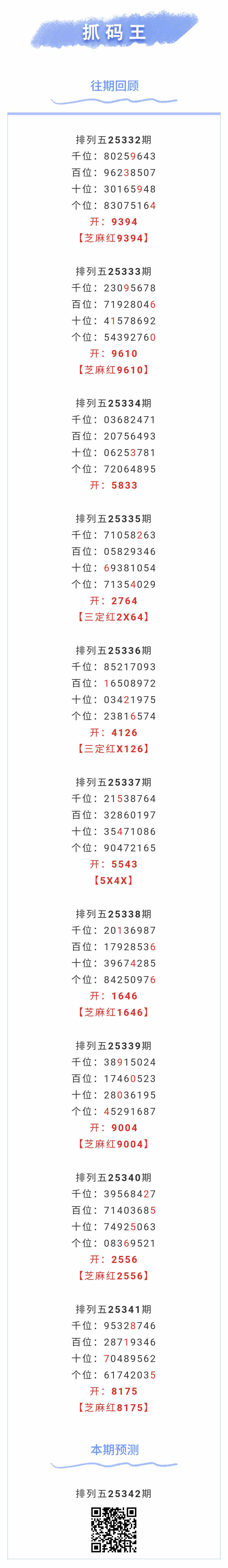 【排列五-342期】芝麻4连红!本月圈红11次芝麻,芝麻近10红6;上期芝麻红8175