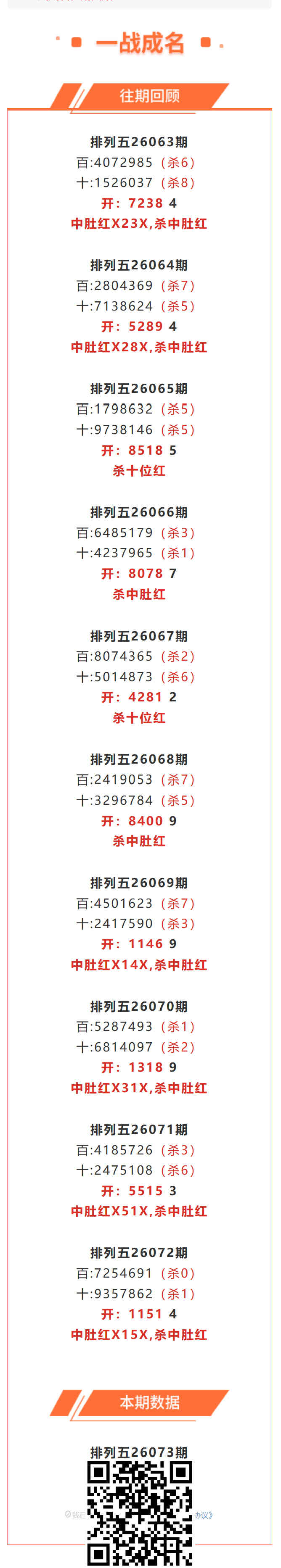 【排列五-073期】杀中肚5连红!本月圈红12次中肚,中肚近10红6;上期中肚红X15X,杀中
