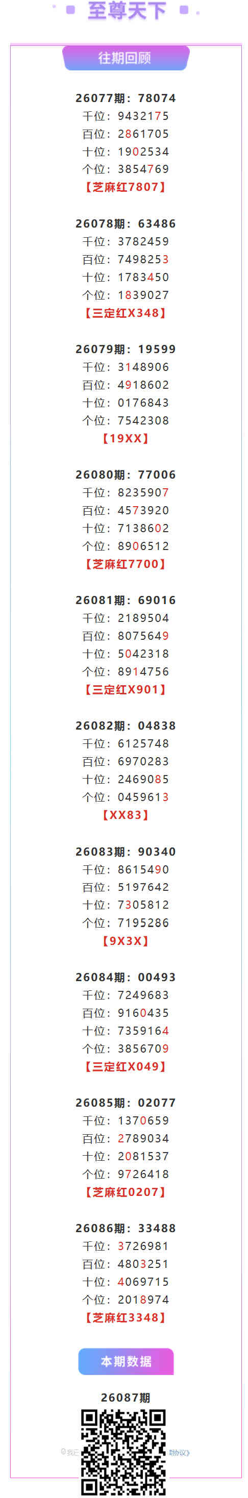 【排列五-26087期】芝麻2连红!本月圈红2次芝麻,芝麻近10红4;上期芝麻红3348