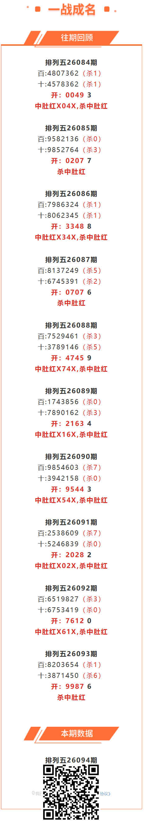 【排列五-094期】杀中肚10连红!本月圈红9次中肚,中肚近10红7;上期杀中肚红