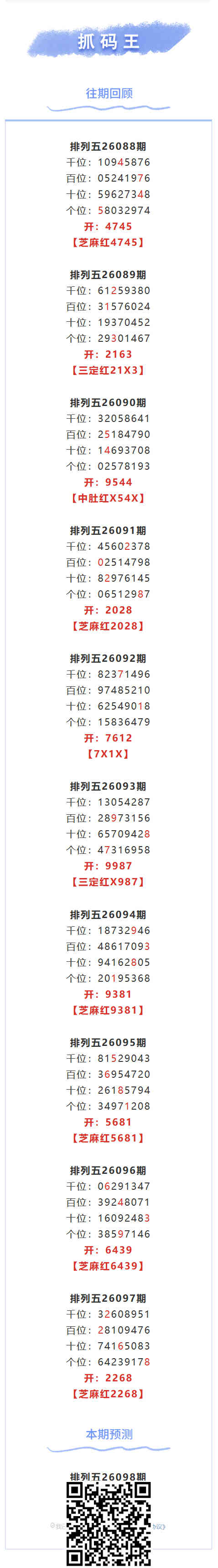 【排列五-098期】芝麻4连红!本月圈红7次芝麻,芝麻近10红6;上期芝麻红2268