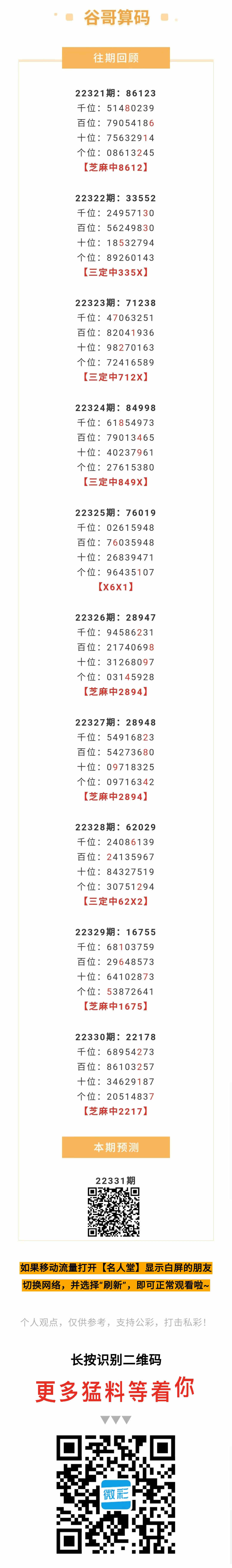 【排列五-331期】2连中!“谷哥算码”上期芝麻中2217,近5中4
