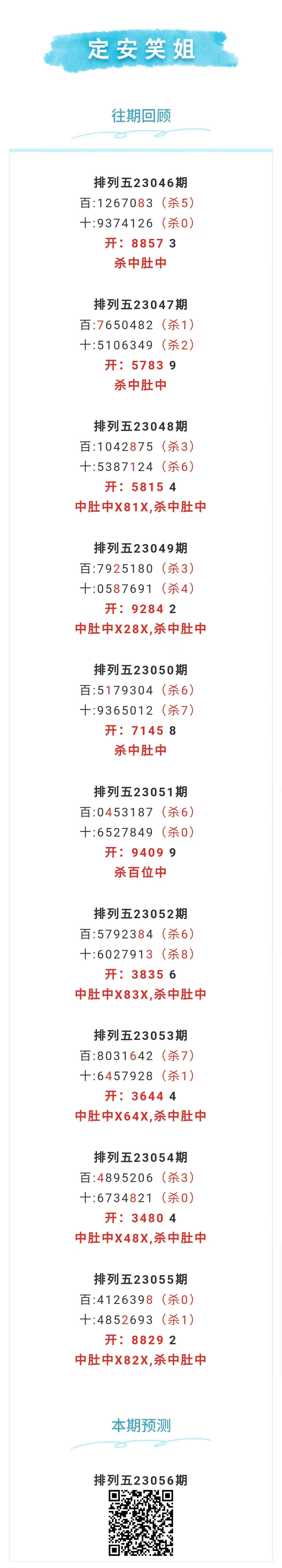 【排列五-056期】上期中肚中X82X,杀中肚中,中肚近10中6;本月圈中4次中肚!