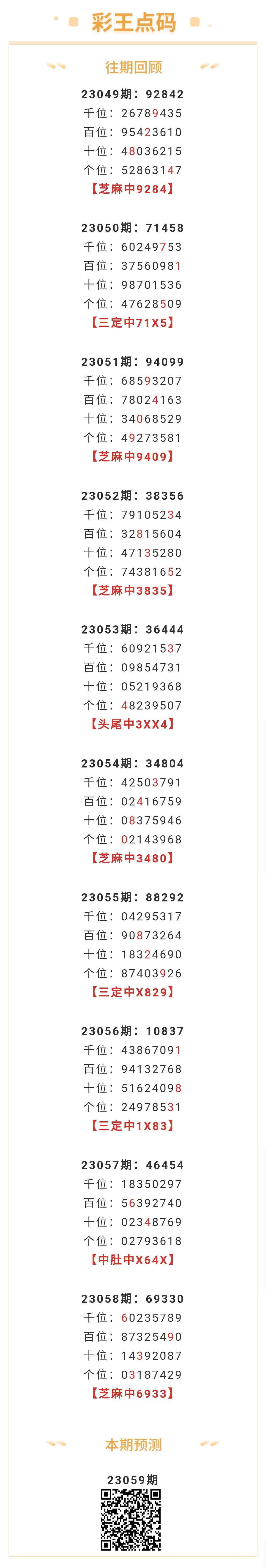 【排列五-059期】上期芝麻中6933,芝麻近10中5;本月圈中4次芝麻!