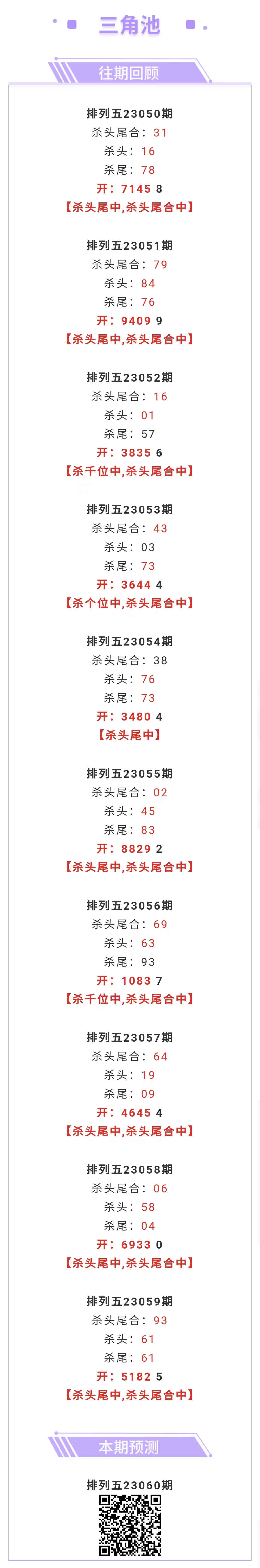 【排列五-060期】上期杀头尾中,杀头尾合中,杀头尾合近10中9;本月圈中9次杀头尾合!