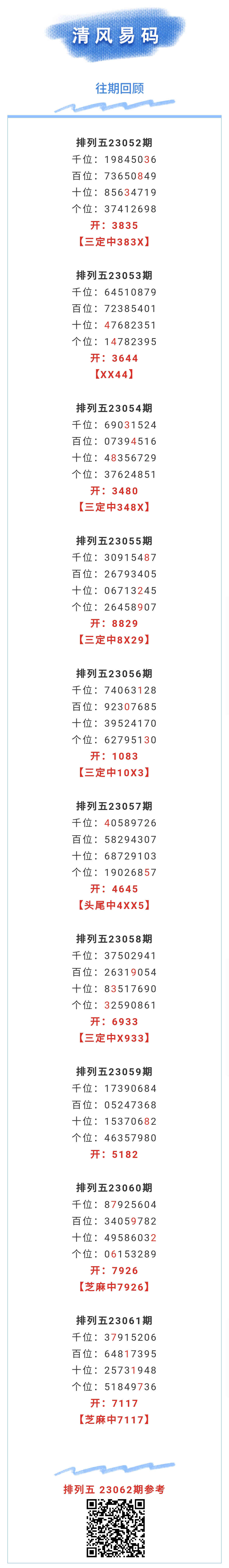 【排列五-062期】上期芝麻中7117,芝麻近10中2;本月圈中3次芝麻!