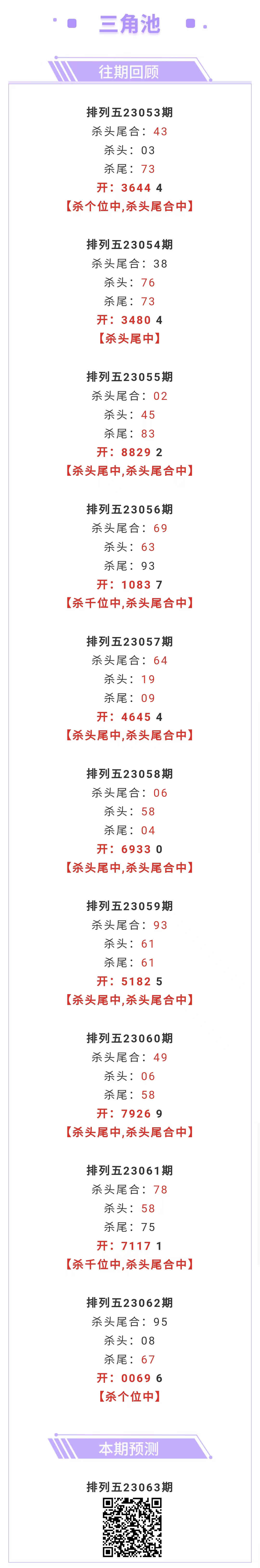 【排列五-063期】上期杀个位中,杀头尾合近10中8;本月圈中11次杀头尾合!