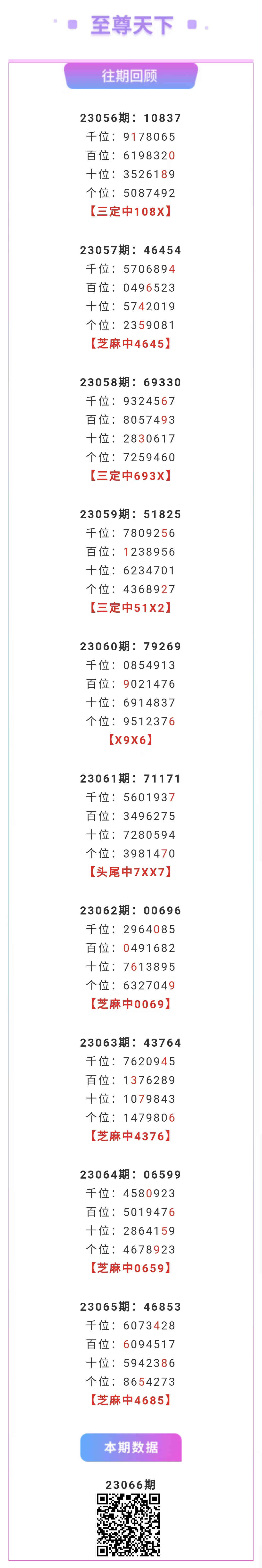 【排列五-066期】上期芝麻中4685,芝麻近10中5;本月圈中6次芝麻!