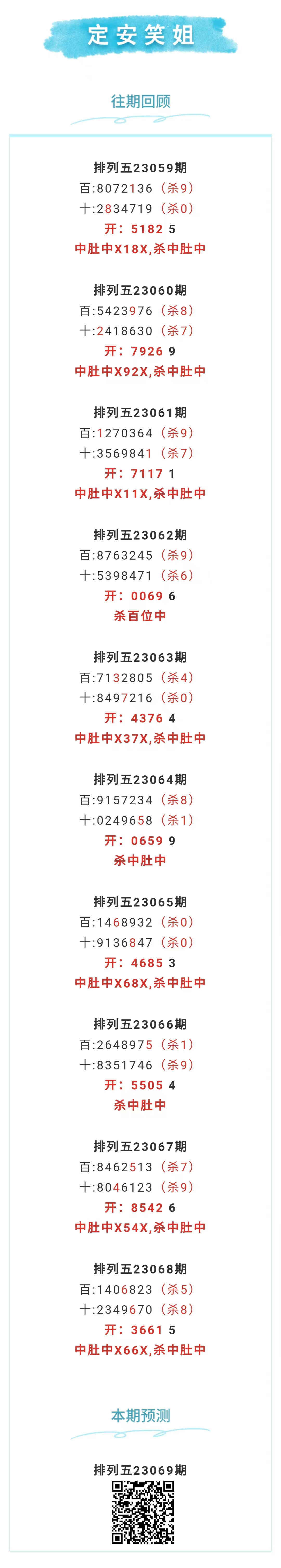【排列五-069期】上期中肚中X66X,杀中肚中,中肚近10中7;本月圈中14次中肚!