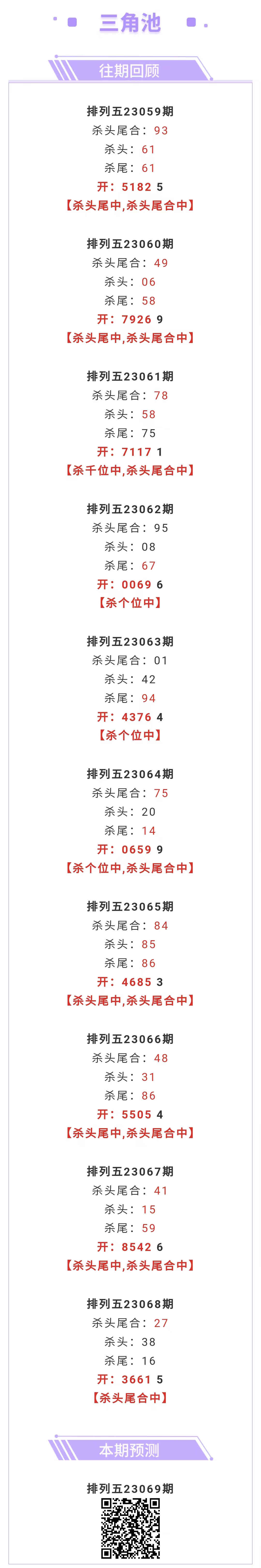 【排列五-069期】上期杀头尾合中,杀头尾合近10中8;本月圈中16次杀头尾合!