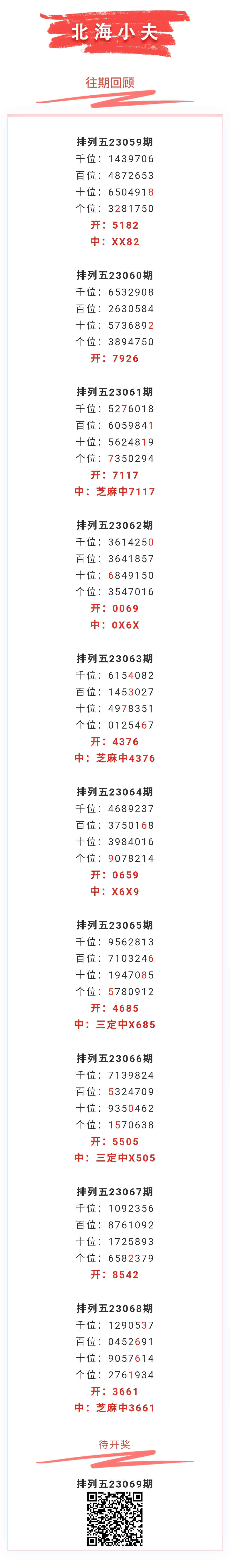 【排列五-069期】上期芝麻中3661,芝麻近10中3;本月圈中6次芝麻!