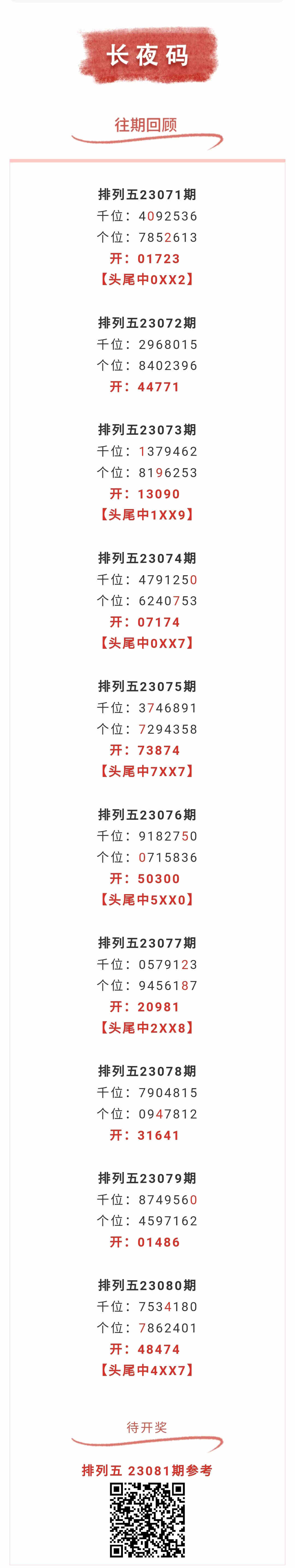 【排列五-081期】上期头尾中4XX7,头尾近10中7;月圈中18次头尾!