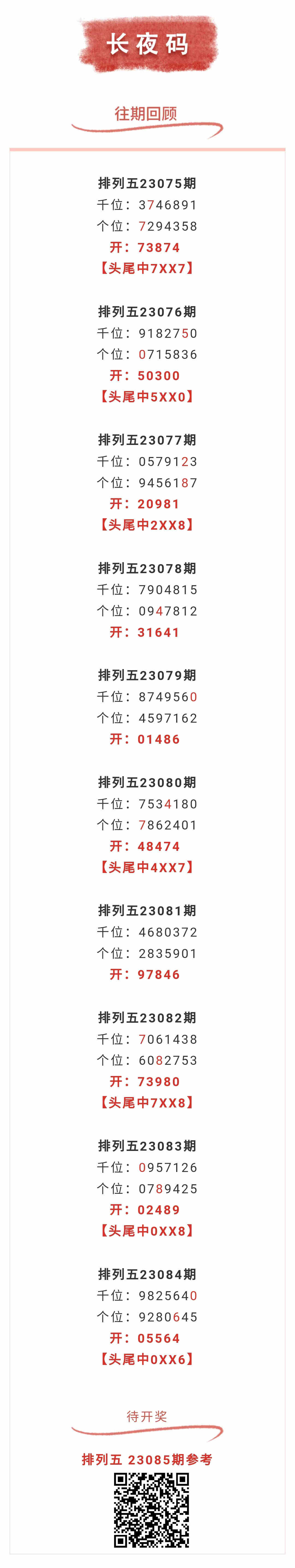 【排列五-085期】上期头尾中0XX6,头尾近10中7;本月圈中3次头尾!