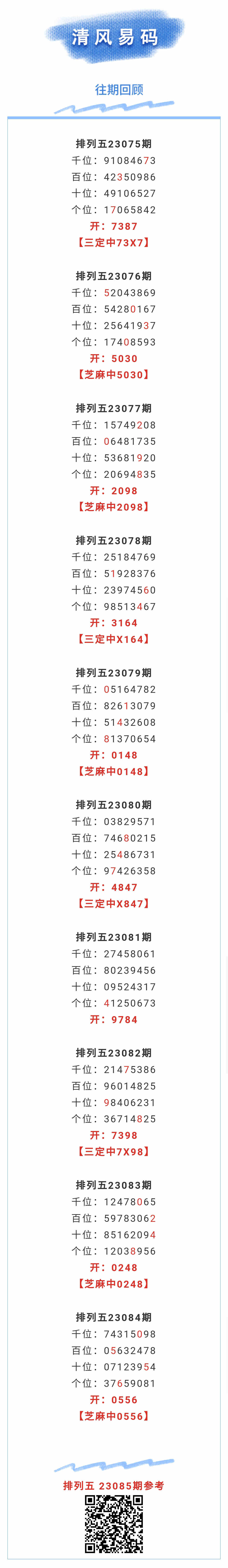 【排列五-085期】芝麻2连中!上期芝麻中0556,近10中5;本月圈中2次芝麻!